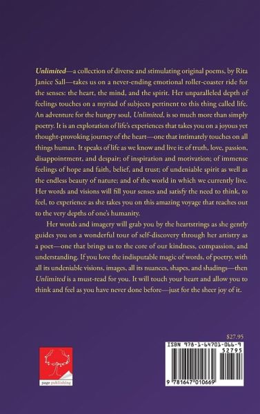 Unlimited--a collection of diverse and stimulating original poems, by Rita Janice Sall--takes us on a never-ending emotional roller-coaster ride for the senses: the heart, the mind, and the spirit. Her unparalleled depth of feelings touches on a myriad of subjects pertinent to this thing called life. An adventure for the hungry soul, Unlimited, is so much more than simply poetry. It is an exploration of life's experiences that takes you on a joyous yet thought-provoking journey of the heart--one that intimately touches on all things human. It speaks of life as we know and live it: of truth, love, passion, disappointment, and despair; of inspiration and motivation; of immense feelings of hope and faith, belief, and trust; of undeniable spirit as well as the endless beauty of nature; and of the world in which we currently live. Her words and visions will fill your senses and satisfy the need to think, to feel, to experience as she takes you on this amazing voyage that reaches out to the very depths of one's humanity. Her words and imagery will grab you by the heartstrings as she gently guides you on a wonderful tour of self-discovery through her artistry as a poet--one that brings us to the core of our kindness, compassion, and understanding. If you love the indisputable magic of words, of poetry, with all its undeniable visions, images, all its nuances, shapes, and shading--then Unlimited is a must-read for you. It will touch your heart and allow you to think and feel as you have never done before--just for the sheer joy of it.