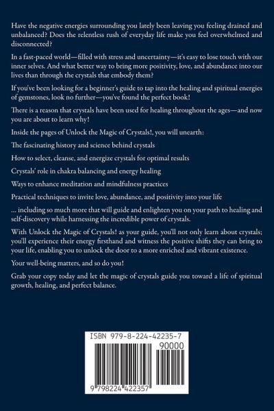 Have the negative energies surrounding you lately been leaving you feeling drained and unbalanced? Does the relentless rush of everyday life make you feel overwhelmed and disconnected? In a fast-paced world-filled with stress and uncertainty-it's easy to lose touch with our inner selves. And what better way to bring more positivity, love, and abundance into our lives than through the crystals that embody them? If you've been looking for a beginner's guide to tap into the healing and spiritual energies of gemstones, look no further-you've found the perfect book! There is a reason that crystals have been used for healing throughout the ages-and now you are about to learn why! Inside the pages of Unlock the Magic of Crystals!, you will unearth: The fascinating history and science behind crystals How to select, cleanse, and energize crystals for optimal results Crystals' role in chakra balancing and energy healing Ways to enhance meditation and mindfulness practices Practical techniques to invite love, abundance, and positivity into your life ... including so much more that will guide and enlighten you on your path to healing and self-discovery while harnessing the incredible power of crystals. With Unlock the Magic of Crystals! as your guide, you'll not only learn about crystals; you'll experience their energy firsthand and witness the positive shifts they can bring to your life, enabling you to unlock the door to a more enriched and vibrant existence. Your well-being matters, and so do you! Grab your copy today and let the magic of crystals guide you toward a life of spiritual growth, healing, and perfect balance.