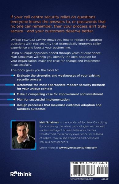If your call centre security relies on questions everyone knows the answers to, or passwords that no one can remember, then your process isn't truly secure - and your customers deserve better. Unlock Your Call Centre shows you how to replace frustrating questions with real security that dramatically improves caller experience and boosts your bottom line. Using a unique approach honed through years of experience, Matt Smallman will help you identify the ideal solution for your organisation, make the case for change and implement it successfully. This book gives you the tools to: Evaluate the strengths and weaknesses of your existing security process Determine the most appropriate modern security methods for your unique context Make a compelling case for improvement and investment Plan for successful implementation Design processes that maximise customer adoption and business outcomes