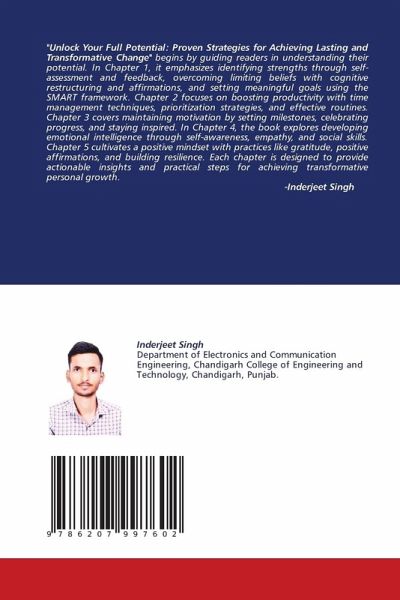 "Unlock Your Full Potential: Proven Strategies for Achieving Lasting and Transformative Change" begins by guiding readers in understanding their potential. In Chapter 1, it emphasizes identifying strengths through self-assessment and feedback, overcoming limiting beliefs with cognitive restructuring and affirmations, and setting meaningful goals using the SMART framework. Chapter 2 focuses on boosting productivity with time management techniques, prioritization strategies, and effective routines. Chapter 3 covers maintaining motivation by setting milestones, celebrating progress, and staying inspired. In Chapter 4, the book explores developing emotional intelligence through self-awareness, empathy, and social skills. Chapter 5 cultivates a positive mindset with practices like gratitude, positive affirmations, and building resilience. Each chapter is designed to provide actionable insights and practical steps for achieving transformative personal growth.-Inderjeet Singh