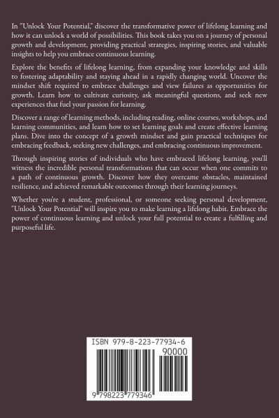 In "Unlock Your Potential," discover the transformative power of lifelong learning and how it can unlock a world of possibilities. This book takes you on a journey of personal growth and development, providing practical strategies, inspiring stories, and valuable insights to help you embrace continuous learning. Explore the benefits of lifelong learning, from expanding your knowledge and skills to fostering adaptability and staying ahead in a rapidly changing world. Uncover the mindset shift required to embrace challenges and view failures as opportunities for growth. Learn how to cultivate curiosity, ask meaningful questions, and seek new experiences that fuel your passion for learning. Discover a range of learning methods, including reading, online courses, workshops, and learning communities, and learn how to set learning goals and create effective learning plans. Dive into the concept of a growth mindset and gain practical techniques for embracing feedback, seeking new challenges, and embracing continuous improvement. Through inspiring stories of individuals who have embraced lifelong learning, you'll witness the incredible personal transformations that can occur when one commits to a path of continuous growth. Discover how they overcame obstacles, maintained resilience, and achieved remarkable outcomes through their learning journeys. Whether you're a student, professional, or someone seeking personal development, "Unlock Your Potential" will inspire you to make learning a lifelong habit. Embrace the power of continuous learning and unlock your full potential to create a fulfilling and purposeful life.