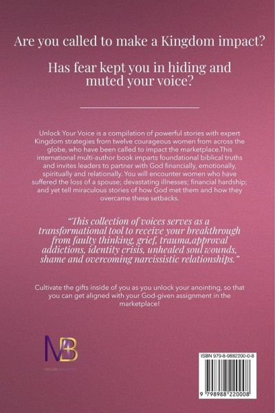 Are you called to make a Kingdom impact? Has fear kept you in hiding and muted your voice? ¿¿¿Unlock Your Voice is a compilation of powerful stories with expert Kingdom strategies from twelve courageous women from across the globe, who have been called to impact the marketplace.This international multi-author book imparts foundational biblical truths and invites leaders to partner with God financially, emotionally, spiritually and relationally. You will encounter women who have suffered the loss of a spouse; devastating illnesses; financial hardship; and yet tell miraculous stories of how God met them and how they overcame these setbacks. "This collection of voices serves as a transformational tool to receive your breakthrough from faulty thinking, grief, trauma,approval addictions, identity crisis, unhealed soul wounds, shame and overcoming narcissistic relationships." Cultivate the gifts inside of you as you unlock your anointing, so that you can get aligned with your God-given assignment in the marketplace!