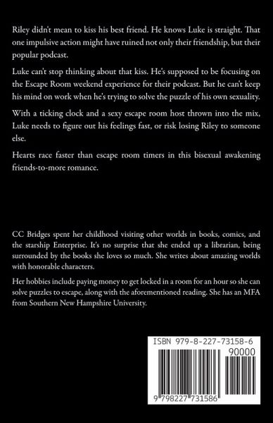 Riley didn't mean to kiss his best friend. He knows Luke is straight. That one impulsive action might have ruined not only their friendship, but their popular podcast. Luke can't stop thinking about that kiss. He's supposed to be focusing on the Escape Room weekend experience for their podcast. But he can't keep his mind on work when he's trying to solve the puzzle of his own sexuality. With a ticking clock and a sexy escape room host thrown into the mix, Luke needs to figure out his feelings fast, or risk losing Riley to someone else. Hearts race faster than escape room timers in this bisexual awakening friends-to-more romance.
