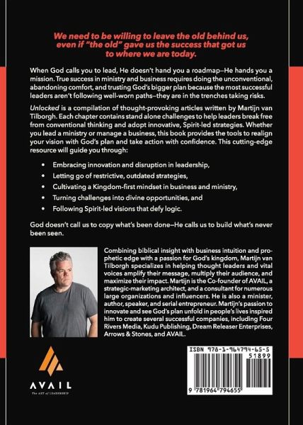 We need to be willing to leave the old behind us, even if "the old" gave us the success that got us to where we are today. When God calls you to lead, He doesn't hand you a roadmap-He hands you a mission. True success in ministry and business requires doing the unconventional, abandoning comfort, and trusting God's bigger plan because the most successful leaders aren't following well-worn paths-they are in the trenches taking risks.Unlocked is a compilation of thought-provoking articles written by Martijn van Tilborgh. Each chapter contains stand alone challenges to help leaders break free from conventional thinking and adopt innovative, Spirit-led strategies. Whether you lead a ministry or manage a business, this book provides the tools to realign your vision with God's plan and take action with confidence. This cutting-edge resource will guide you through:¿Embracing innovation and disruption in leadership,¿Letting go of restrictive, outdated strategies,¿Cultivating a Kingdom-first mindset in business and ministry,¿Turning challenges into divine opportunities, and¿Following Spirit-led visions that defy logic.God doesn't call us to copy what's been done-He calls us to build what's never been seen.