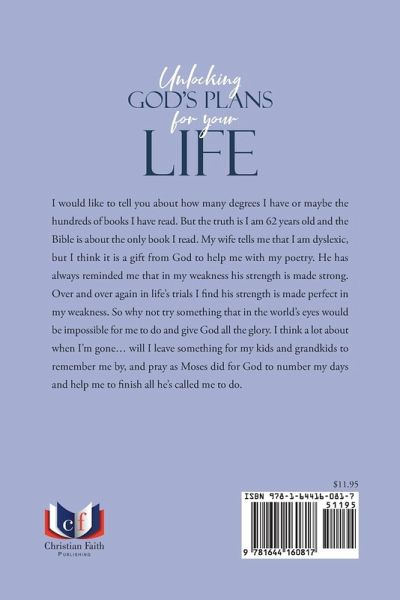 I would like to tell you about how many degrees I have or maybe the hundreds of books I have read. But the truth is I am 62 years Old and the Bible is about the only book I read. My wife tells me that I am dyslexic, but I think it is a gift from God to help me with my poetry. He has always reminded me that in my weakness his strength is made strong. Over and over again in life's trials I find his strength is made perfect in my weakness. So why not try something that in the world's eyes would be impossible for me to do and give God all the glory. I think a lot about when I'm gone… will I leave something for my kids and grandkids to remember me by, and pray as Moses did for God to number my days and help me to finish all he's called me to do.
