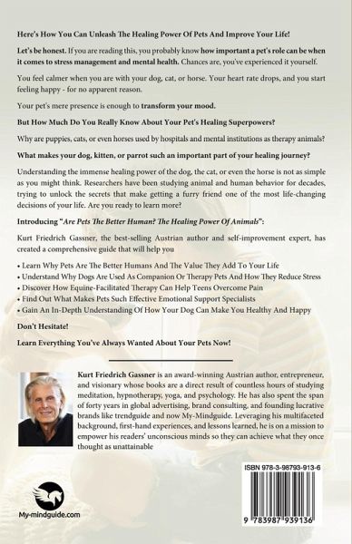 Here's How You Can Unleash The Healing Power Of Pets And Improve Your Life! Let's be honest. If you are reading this, you probably know how important a pet's role can be when it comes to stress management and mental health. Chances are, you've experienced it yourself. You feel calmer when you are with your dog, cat, or horse. Your heart rate drops, and you start feeling happy - for no apparent reason. Your pet's mere presence is enough to transform your mood. But How Much Do You Really Know About Your Pet's Healing Superpowers? Why are puppies, cats, or even horses used by hospitals and mental institutions as therapy animals? What makes your dog, kitten, or parrot such an important part of your healing journey? Understanding the immense healing power of the dog, the cat, or even the horse is not as simple as you might think. Researchers have been studying animal and human behavior for decades, trying to unlock the secrets that make getting a furry friend one of the most life-changing decisions of your life. Are you ready to learn more? Introducing "Are Pets The Better Human? The Healing Power Of Animals": Kurt Friedrich Gassner, the best-selling Austrian author and self-improvement expert, has created a comprehensive guide that will help you ¿¿¿¿ Learn Why Pets Are The Better Humans And The Value They Add To Your Life ¿¿¿¿ Understand Why Dogs Are Used As Companion Or Therapy Pets And How They Reduce Stress ¿¿¿¿ Discover How Equine-Facilitated Therapy Can Help Teens Overcome Pain ¿¿¿¿ Find Out What Makes Pets Such Effective Emotional Support Specialists ¿¿¿¿ Gain An In-Depth Understanding Of How Your Dog Can Make You Healthy And Happy Don't Hesitate! Learn Everything You've Always Wanted About Your Pets Now!