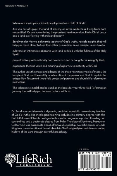 Where are you in your spiritual development as a child of God? Are you out of Egypt, the land of slavery, or in the wilderness, living from bare necessities? Or are you entering the promised land: abundant life in Christ Jesus and a land overflowing with milk and honey? Sarel van der Merwe, a dynamic teacher of God's truths, reveals insights that will help you move closer to God the Father as a radical Jesus disciple. Learn how to: cultivate an intimate relationship with- and be filled with the fullness of the Holy Spirit; pray effectively with authority and power as a son or daughter of Almighty God; experience the true value and meaning of a journey to maturity with God. The author uses the image and allegory of the three-room tabernacle of Moses, the temple of God, and the earthly manifestation of the presence of God, to explain the unique New Testament three-fold process of personal and church life reformation into Christ. The tabernacle model can be used as the basis for your three-fold Reformation journey that will help you become mature in Christ.