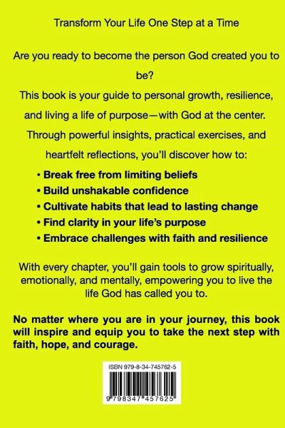 Transform Your Life One Step at a Time Are you ready to become the person God created you to be? This book is your guide to personal growth, resilience, and living a life of purpose-with God at the center. Through powerful insights, practical exercises, and heartfelt reflections, you'll discover how to: ✨Break free from limiting beliefs ✨Build unshakable confidence ✨Cultivate habits that lead to lasting change ✨Find clarity in your life's purpose ✨Embrace challenges with faith and resilience With every chapter, you'll gain tools to grow spiritually, emotionally, and mentally, empowering you to live the life God has called you to. No matter where you are in your journey, this book will inspire and equip you to take the next step with faith, hope, and courage.