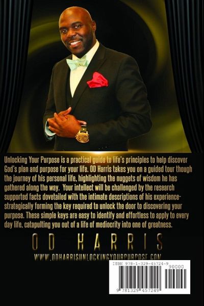 Unlocking Your Purpose is a practical guide to life's principles to help discover God's plan and purpose for your life. OD Harris takes you on a guided tour though the journey of his personal life, highlighting the nuggets of wisdom he has gathered along the way. Your intellect will be challenged by the research supported facts dovetailed with the intimate descriptions of his experience- strategically forming the key required to unlock the door to discovering your purpose. These simple keys are easy to identify and effortless to apply to every day life, catapulting you out of a life mediocrity into one of greatness.