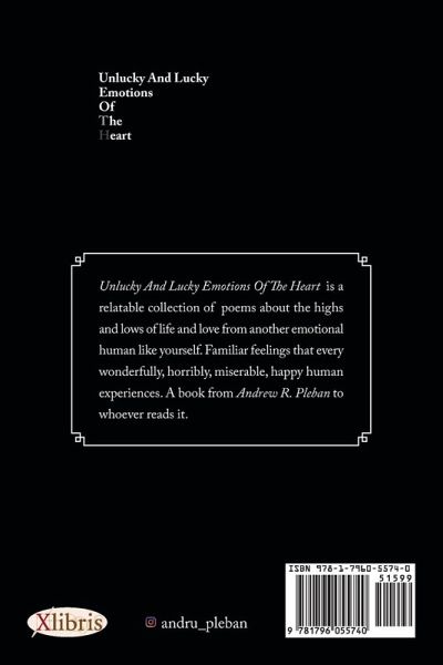 Unlucky And Lucky Emotions Of The Heart is a relatable collection of poems about the highs and lows of life and love from another emotional human like yourself. Familiar feelings that every wonderfully, horribly, miserable, happy human experiences. A book from Andrew R. Pleban to whoever reads it.