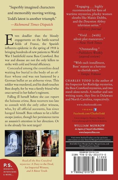 The critically acclaimed, New York Times bestselling author of the Ian Rutledge mystery series, Charles Todd once again spotlights World War I nurse Bess Crawford in An Unmarked Grave. Gripping, powerful, and evocative, this superb mystery masterwork unfolds during the deadly Spanish Influenza pandemic of 1918, as Bess discovers the body of a murdered British officer among the many dead and sets out to unmask a craven killer.