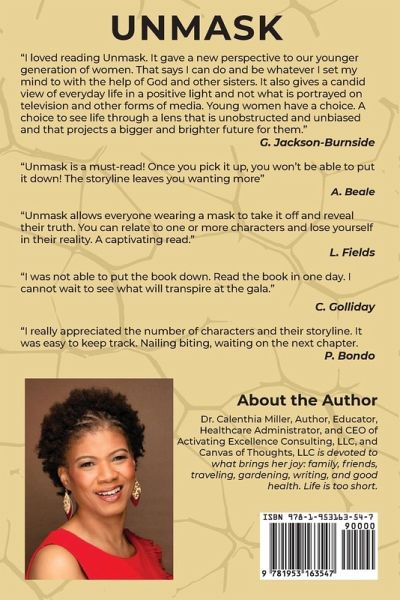 Unmask by Dr. Calenthia Yvette Miller centers on three attractive professionals and their search for healing. Full of sensual detail and rollicking conversation, the narrative explores the lives of Anya McMichael, Royce Blackmon, and Sebastián Collins as they cope with past traumas while trying to learn what they really want from life. The protagonist is Anya, a successful executive who is forced by migraines, exhaustion, and finally, a concussion, to take time for desperately needed self-care, and to cope with her grief for her father. With the help of her friends and colleagues, Leah and Abbey, she begins focusing on her own needs and desires during a leave of absence. Meanwhile, she is pursued by two extremely handsome men and begins to form a daughter-like bond with an elegant dress designer who is a bereaved mother. ¿You won't be able to put this page-turner down. Now is the time to grab your copy! The Saga begins.....