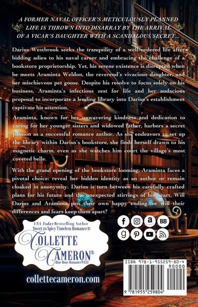 A former naval officer's meticulously planned life is thrown into disarray by the arrival of a vicar's daughter with a scandalous secret... Darius Westbrook seeks the tranquility of a well-ordered life after bidding adieu to his naval career and embracing the challenge of a bookstore proprietorship. Yet, his serene existence is disrupted when he meets Araminta Weldon, the reverend's vivacious daughter, and her mischievous pet goose. Despite his resolve to focus solely on his business, Araminta's infectious zest for life and her audacious proposal to incorporate a lending library into Darius's establishment captivate his attention. Araminta, known for her unwavering kindness and dedication to caring for her younger sisters and widowed father, harbors a secret passion as a successful romance author. As she endeavors to set up the library within Darius's bookstore, she finds herself drawn to his magnetic charm, even as she watches him court the village's most coveted belle. With the grand opening of the bookstore looming, Araminta faces a pivotal choice: reveal her hidden identity as an author or remain cloaked in anonymity. Darius is torn between his carefully crafted plans for his future and the unexpected stirrings of his heart. Will Darius and Araminta pen their own happy ending, or will their differences and fears keep them apart? ____________________________________________________________________ Secrets, Suspense, and Swoon-Worthy Romance... If you enjoy reading historical romances featuring lovable rogues, enemies to lovers, second chances, class differences, forced proximity, mistaken identities, and opposites attract, you'll adore USA Today Bestselling author Collette Cameron's captivating series: CHRONICLES OF THE WESTBROOK BRIDES. These evocative and compelling tales are infused with a pinch of mystery and suspense, a dash of humor, and a splash of soul-searing emotion. Settle into a cozy reading nook with your favorite beverage and escape into this page-turning, entertaining Regency romance series. Though each book can be read as a stand-alone, readers prefer to enjoy the series in order. CHRONICLES OF THE WESTBROOK BRIDES: Midnight Christmas Waltz Mission at Midnight The Midnight Marquess Holly, Mistletoe, & Midnight Snow The Wallflower's Midnight Waltz Minuet at Midnight Kiss a Rake at Midnight Unmasked at Midnight Memories Made at Midnight Once Upon a Midnight Dream CHECK OUT USA TODAY BESTSELLING AUTHOR, COLLETTE CAMERON'S COMPLETE LIBRARY OF REGENCY AND SCOTTISH HIGHLANDER ROMANCE SERIES: Chronicles of the Westbrook Brides Dukes Come Calling For the Love of an Earl Heart of a Scot Highland Heather Romancing a Scot: Castle Brides Secrets of Scandalous Ladies The Culpepper Misses The Honorable Rogues®