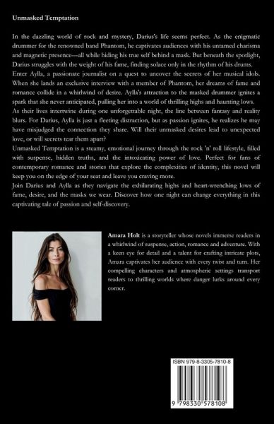 Unmasked Temptation In the dazzling world of rock and mystery, Darius's life seems perfect. As the enigmatic drummer for the renowned band Phantom, he captivates audiences with his untamed charisma and magnetic presence-all while hiding his true self behind a mask. But beneath the spotlight, Darius struggles with the weight of his fame, finding solace only in the rhythm of his drums. Enter Aylla, a passionate journalist on a quest to uncover the secrets of her musical idols. When she lands an exclusive interview with a member of Phantom, her dreams of fame and romance collide in a whirlwind of desire. Aylla's attraction to the masked drummer ignites a spark that she never anticipated, pulling her into a world of thrilling highs and haunting lows. As their lives intertwine during one unforgettable night, the line between fantasy and reality blurs. For Darius, Aylla is just a fleeting distraction, but as passion ignites, he realizes he may have misjudged the connection they share. Will their unmasked desires lead to unexpected love, or will secrets tear them apart? Unmasked Temptation is a steamy, emotional journey through the rock 'n' roll lifestyle, filled with suspense, hidden truths, and the intoxicating power of love. Perfect for fans of contemporary romance and stories that explore the complexities of identity, this novel will keep you on the edge of your seat and leave you craving more.