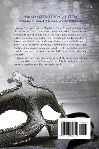 Heiress Lena Langford longs for a chance to be free of the expectations attached to her name and position, and after her mother dies, her last time to the Langford life is broken. Following a scribbled return address on a letter, she runs away to Karsch, a thriving city on the Mississippi. But once there, she realizes there is more to her new friend, Trent Knight, than she first thought. Just what secrets does he hide behind his charming facade? Chasing after secrets is dangerous work, all the more for a girl new to the world of shadows. Trusting Trent will be her only option if she wants to keep her new life - or survive at all.
