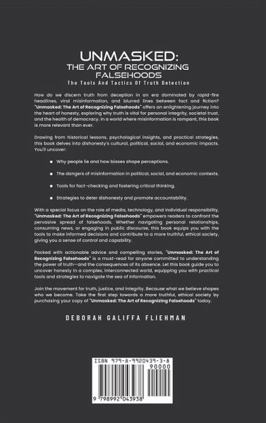 How do we separate truth from deception in a world flooded with rapid headlines, viral misinformation, and blurred lines between fact and fiction? Unmasked: The Art of Recognizing Falsehoods offers a compelling exploration of honesty's role in personal integrity, societal trust, and democracy's survival. In an era where misinformation thrives, this book is more essential than ever. Blending historical insights, psychology, and practical strategies, Unmasked examines deception's impact on culture, politics, and the economy. Inside, you'll discover:Why people lie and how cognitive biases influence perception. The dangers of misinformation in politics, social movements, and financial systems. Tools for fact-checking and developing critical thinking skills. Strategies to deter dishonesty and foster accountability. With a special focus on media, technology, and personal responsibility, Unmasked empowers readers to combat falsehoods. Whether you're evaluating news, participating in discussions, or managing personal relationships, this book provides the tools to make informed decisions and champion ethical discourse. Packed with real-world examples and actionable guidance, Unmasked: The Art of Recognizing Falsehoods is a must-read for anyone dedicated to truth. Navigate today's information landscape with confidence and take the first step toward a more honest, ethical world.