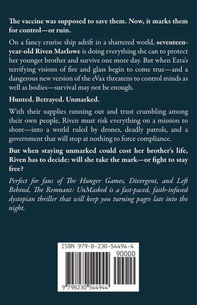 The vaccine was supposed to save them. Now, it marks them for control-or ruin. On a fancy crurise ship adrift in a shattered world, seventeen-year-old Riven Marlowe is doing everything she can to protect her younger brother and survive one more day. But when Ezra's terrifying visions of fire and glass begin to come true-and a dangerous new version of the eVax threatens to control minds as well as bodies-survival may not be enough. Hunted. Betrayed. Unmarked. With their supplies running out and trust crumbling among their own people, Riven must risk everything on a mission to shore-into a world ruled by drones, deadly patrols, and a government that will stop at nothing to force compliance. But when staying unmarked could cost her brother's life, Riven has to decide: will she take the mark-or fight to stay free? Perfect for fans of The Hunger Games, Divergent, and Left Behind, The Remnant: UnMasked is a fast-paced, faith-infused dystopian thriller that will keep you turning pages late into the night.