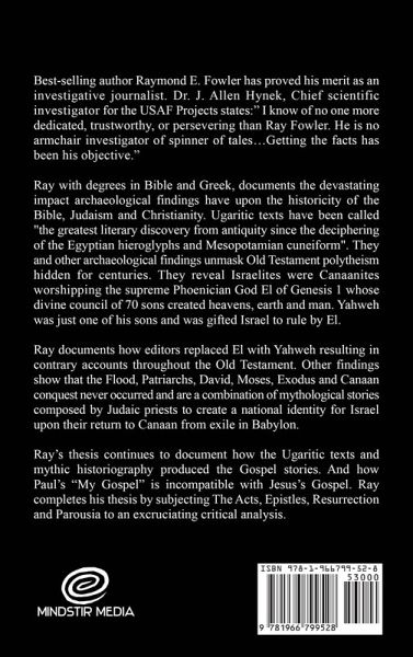 Best-selling author Raymond E. Fowler has proved his merit as an investigative journalist. Dr. J. Allen Hynek, Chief scientific investigator for the USAF Projects states: " I know of no one more dedicated, trustworthy, or persevering than Ray Fowler. He is no armchair investigator of spinner of tales...Getting the facts has been his objective." Ray with degrees in Bible and Greek, documents the devastating impact archaeological findings have upon the historicity of the Bible, Judaism and Christianity. Ugaritic texts have been called "the greatest literary discovery from antiquity since the deciphering of the Egyptian hieroglyphs and Mesopotamian cuneiform". They and other archaeological findings unmask Old Testament polytheism hidden for centuries. They reveal Israelites were Canaanites worshipping the supreme Phoenician God El of Genesis 1 whose divine council of 70 sons created heavens, earth and man. Yahweh was just one of his sons and was gifted Israel to rule by El. Ray documents how editors replaced El with Yahweh resulting in contrary accounts throughout the Old Testament. Other findings show that the Flood, Patriarchs, David, Moses, Exodus and Canaan conquest never occurred and are a combination of mythological stories composed by Judaic priests to create a national identity for Israel upon their return to Canaan from exile in Babylon. Ray's thesis continues to document how the Ugaritic texts and mythic historiography produced the Gospel stories. And how Paul's "My Gospel" is incompatible with Jesus's Gospel. Ray completes his thesis by subjecting The Acts, Epistles, Resurrection and Parousia to an excruciating critical analysis.