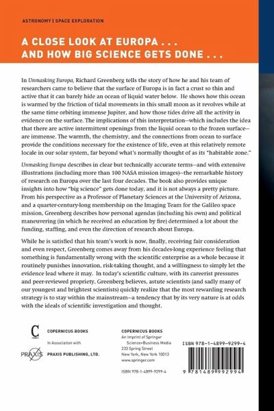 Unmasking Europa describes in clear but technically accurate terms-and with extensive illustrations (including more than 100 NASA mission images)-the remarkable history of research on Europa over the last four decades. The book also provides unique insights into how "big science" gets done today, and it is not always a pretty picture. From his perspective as a Professor of Planetary Sciences at the University of Arizona, and a quarter-century-long membership on the Imaging Team for the Galileo space mission, Greenberg describes how personal agendas (including his own) and political maneuvering (in which he received an education by fire) determined a lot about the funding, staffing, and even the direction of research about Europa.