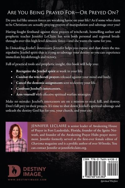 Are You Being Prayed For-Or Preyed On? Do you feel like unseen forces are wreaking havoc on your life? As if some who claim to be Christians are actually praying prayers of manipulation and sabotage over you? Having fought firsthand against these prayers of witchcraft, bestselling author and prophetic teacher Jennifer LeClaire has seen both personal and regional breakthroughs over this high-level demonic force-and she wants the same for you. In Unmasking Jezebel's Intercessors, Jennifer helps you expose and shut down the manipulative Jezebel spirit that is trying to sabotage your destiny so you can experience immediate breakthrough and victory. Full of practical tools and prophetic insight, this book will help you: Recognize the Jezebel spirit at work in your life. Combat the witchcraft prayers released against your mind and body. Cancel the demonic assignments sent to destroy your life. Confront Jezebel's intercessors. Arm yourself with effective spiritual warfare strategies. Make no mistake: Jezebel's intercessors are on a mission to steal, kill, and destroy. Don't fall prey to their prayers. It's time to shut down Jezebel's spiritual sabotage and unleash the destiny God has for you, your church, and your city.