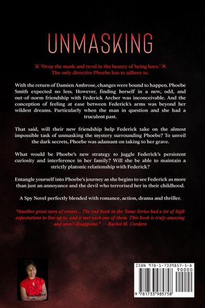 "You are a talented writer. Unmasking was a great read." - Juliano Agertt (Jusky), Singer & Songwriter Phoebe thought she was an expert in leading a double life. But the moment she accepted Federick's friendship, her vault of secrets began to crack. Wary by nature in a world of secrecy, pain, danger and business moguls, Phoebe Smith, a loving mother and covert spy, goes against her better judgement and befriend her 'boss', Federick Archer. Then to her horror, he gets a little too close for comfort. Once in control, Phoebe begins to lose her grip...and suddenly, the heat is on. Because as they grow closer, she begins to see him as more than just the devil who terrorised her in their childhood. And for the first time, her secret life is in danger of being exposed. Will she be able to keep her secrets hidden? Or will he seduce them out of her? A Spy Novel perfectly blended with romance, action and drama.¿¿