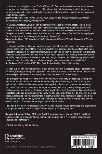 Stephen J. Betchen illuminates unmet expectations as one of the leading causes of relationship problems, offering an integrative, systemic, and conflict-oriented treatment model that will help both therapists and couples develop happier and more realistic relationships.