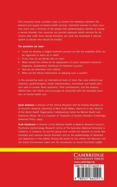 This book considers ways to resolve the imbalance between the demand and supply of mental health services. Treatment services in most countries reach only a minority of people identified as suffering from a mental disorder. Few countries can provide adequate health services for all the mentally ill, yet none has developed a rational system to decide who should be treated. The questions are clear. Could we develop a staged treatment process to reach all in need? If not, how do we decide who to treat? What should the criteria be for deployment of scarce treatment resources? How do we determine such criteria? What are the ethical implications of applying such criteria? In this pioneering work, an international team of eminent psychiatrists, epidemiologists, health administrators, economists and health planners examine these questions. The result will inform and encourage all concerned with the equitable provision of mental health care.