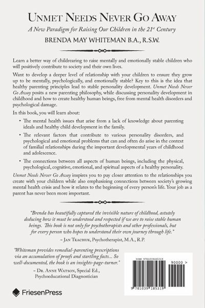 Learn a better way of childrearing to raise mentally and emotionally stable children who will positively contribute to society and their own lives. Want to develop a deeper level of relationship with your children to ensure they grow up to be mentally, psychologically, and emotionally stable? Key to this is the idea that healthy parenting principles lead to stable personality development. Unmet Needs Never Go Away posits a new parenting philosophy, while discussing personality development in childhood and how to create healthy human beings, free from mental health disorders and psychological damage. In this book, you will learn about: ¿ The mental health issues that arise from a lack of knowledge about parenting ideals and healthy child development in the family. ¿ the relevant factors that contribute to various personality disorders, and psychological and emotional problems that can and often do arise in the context of familial relationships during the important developmental years of childhood and adolescence. ¿ the connections between all aspects of human beings, including the physical, psychological, cognitive, emotional, and spiritual aspects of a healthy personality. Unmet Needs Never Go Away inspires you to pay closer attention to the relationships you create with your children while also emphasizing connections between society's growing mental health crisis and how it relates to the beginning of every person's life. Your job as a parent has never been more important.