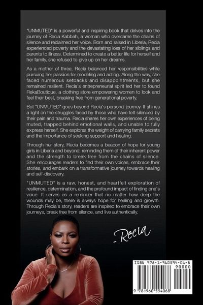 "UNMUTED" is a powerful and inspiring book that delves into the journey of Recia Kabbah, a woman who overcame the chains of silence and reclaimed her voice. Born and raised in Liberia, Recia experienced poverty and the devastating loss of her siblings and parents to illness. Determined to create a better life for herself and her family, she refused to give up on her dreams. As a mother of three, Recia balanced her responsibilities while pursuing her passion for modeling and acting. Along the way, she faced numerous setbacks and disappointments, but she remained resilient. Recia's entrepreneurial spirit led her to found RekaBoutique, a clothing store empowering women to look and feel their best, breaking free from generational poverty. But "UNMUTED" goes beyond Recia's personal journey. It shines a light on the struggles faced by those who have felt silenced by their pain and trauma. Recia shares her own experiences of being muted, trapped behind emotional walls, and unable to fully express herself. She explores the weight of carrying family secrets and the importance of seeking support and healing. Through her story, Recia becomes a beacon of hope for young girls in Liberia and beyond, reminding them of their inherent power and the strength to break free from the chains of silence. She encourages readers to find their own voices, embrace their stories, and embark on a transformative journey toward healing and self-discovery. "UNMUTED" is a raw, honest, and heartfelt exploration of resilience, determination, and the profound impact of finding one's voice. It serves as a reminder that no matter how deep the wounds may be, there is always hope for healing and growth. Through Recia's story, readers are inspired to embrace their own journeys, break free from silence, and live authentically.