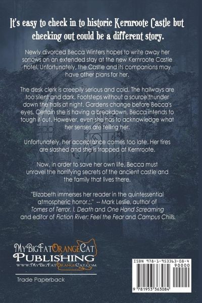 It's easy to check in to historic Kernroote Castle but checking out could be a different story. Newly divorced Becca Winters hopes to write away her sorrows on an extended stay at the new Kernroote Castle hotel. Unfortunately, the Castle and its companions may have other plans for her. The desk clerk is creepily serious and cold. The hallways are too silent and dark. Footsteps without a source thunder down the halls at night. Gardens change before Becca's eyes. Certain she is having a breakdown, Becca intends to tough it out. However, even she has to acknowledge what her senses are telling her. Unfortunately, her acceptance comes too late. Her tires are slashed and she is trapped at Kernroote. Now, in order to save her own life, Becca must unravel the horrifying secrets of the ancient castle and the family that lives there. "Elizabeth immerses her reader in the quintessential atmospheric horror, complete with the tension of the panicked fleeing from past nightmares, a foreboding Gothic Castle, and a looming terror that merges modern struggles with a slowly unraveling historic mystery. Make sure you bring a flashlight before you dig in. Oh, and maybe some Holy Water for good measure. Because Elizabeth isn't afraid to drag you through every conceivable dark and shadowy corner." -- Mark Leslie, author of Tomes of Terror, I, Death and One Hand Screaming and editor of Fiction River: Feel the Fear and Campus Chills.