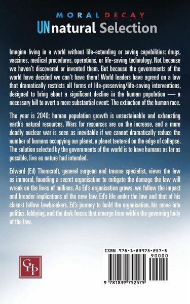 The year 2040. Earth is now a world where life-extending/saving drugs, procedures and technologies are severely restricted. Not because we don't have them or haven't discovered or invented them. But because the governments of the world enacted a law to severely restrict them! Human population growth has pushed the planet to its limits. As wars for resources continued to escalate. World leaders agree that to avert a global nuclear war and human extinction. The human population had to significantly decline by living as nature intended. Many disagreed, and secret organisations began to fight back, saving lives illegally.