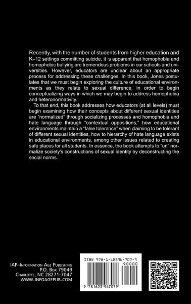 Recently, with the number of students from higher education and K-12 settings committing suicide, it is apparent that homophobia and homophobic bullying are tremendous problems in our schools and universities. However, educators are unclear about an appropriate process for addressing these challenges. In this book, Jones postulates that we must begin exploring the culture of educational environments as they relate to sexual difference, in order to begin conceptualizing ways in which we may begin to address homophobia and heteronormativity. To that end, this book addresses how educators (at all levels) must begin examining how their concepts about different sexual identities are "normalized" through socializing processes and schooling. In doing so, this book examines how individuals construct meanings about homophobia and hate language through "contextual oppositions, " how educational environments maintain a ''false tolerance" when claiming to be tolerant of different sexual identities, how a hierarchy of hate language exists in educational environments, among other issues related to creating safe places for all students. In essence, the book attempts to "un"normalize society's constructions of sexual identity by deconstructing the social norms.