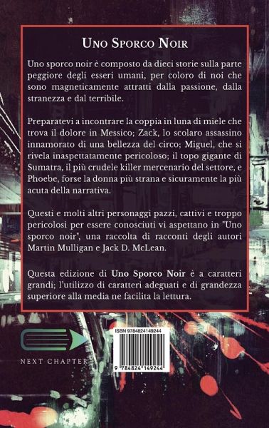 Uno sporco noir è composto da dieci storie sulla parte peggiore degli esseri umani, per coloro di noi che sono magneticamente attratti dalla passione, dalla stranezza e dal terribile. Preparatevi a incontrare la coppia in luna di miele che trova il dolore in Messico; Zack, lo scolaro assassino innamorato di una bellezza del circo; Miguel, che si rivela inaspettatamente pericoloso; il topo gigante di Sumatra, il più crudele killer mercenario del settore, e Phoebe, forse la donna più strana e sicuramente la più acuta della narrativa. Questi e molti altri personaggi pazzi, cattivi e troppo pericolosi per essere conosciuti vi aspettano in "Uno sporco noir", una raccolta di racconti degli autori Martin Mulligan e Jack D. McLean. Edizione A Caratteri Grandi
