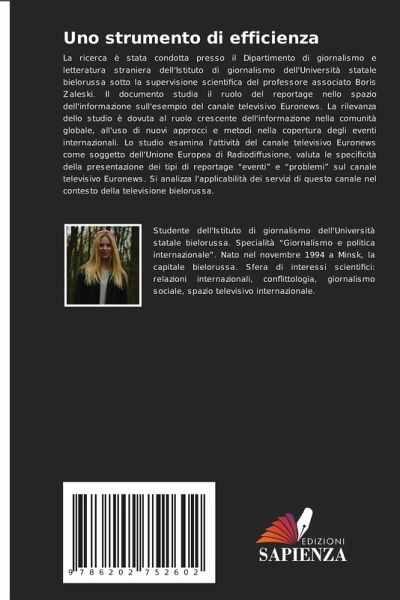 La ricerca è stata condotta presso il Dipartimento di giornalismo e letteratura straniera dell'Istituto di giornalismo dell'Università statale bielorussa sotto la supervisione scientifica del professore associato Boris Zaleski. Il documento studia il ruolo del reportage nello spazio dell'informazione sull'esempio del canale televisivo Euronews. La rilevanza dello studio è dovuta al ruolo crescente dell'informazione nella comunità globale, all'uso di nuovi approcci e metodi nella copertura degli eventi internazionali. Lo studio esamina l'attività del canale televisivo Euronews come soggetto dell'Unione Europea di Radiodiffusione, valuta le specificità della presentazione dei tipi di reportage "eventi" e "problemi" sul canale televisivo Euronews. Si analizza l'applicabilità dei servizi di questo canale nel contesto della televisione bielorussa.
