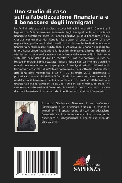 Le fonti di educazione finanziaria accessibili agli immigrati in Canada e il legame tra l'alfabetizzazione finanziaria degli immigrati e le loro decisioni finanziarie potrebbero avere un impatto negativo sul loro benessere e sulla crescita demografica del Canada. Lo scopo di questo studio di caso esplorativo qualitativo è stato quello di esplorare le fonti di educazione finanziaria degli immigrati subito dopo il loro arrivo in Canada e il legame tra le loro conoscenze finanziarie e le decisioni finanziarie. L'ipotesi del ciclo di vita, la teoria della scelta razionale e la teoria della razionalità limitata sono state alla base dello studio. La raccolta dei dati dal campione mirato ha incluso interviste semistrutturate faccia a faccia con 13 immigrati adulti e una discussione in un focus group con 6 immigrati adulti, tutti residenti, lavoratori o proprietari di un'attività commerciale nella città di Lloydminster. I dati sono stati raccolti tra il 12 e il 19 dicembre 2016. Utilizzando la procedura di analisi dei dati in 5 fasi di Yin, i 6 temi che hanno descritto il modello tra il benessere degli immigrati e i loro livelli di alfabetizzazione finanziaria sono le istituzioni sociali, le istituzioni economiche, la pressione che impatta sulle decisioni finanziarie, la facilità di credito che impatta sulle decisioni finanziarie, le emozioni che impattano sulle decisioni finanziarie.