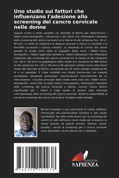 Questo studio è stato condotto nel distretto di Hoima per determinare i fattori socio-demografici, istituzionali e dei clienti che influenzano l'adozione dello screening del cancro cervicale tra le donne di età compresa tra i 20 e i 60 anni, in modo da migliorare la diagnosi precoce e ridurre la morbilità e la mortalità associate a questa malattia. Le domande di ricerca che hanno guidato lo studio sono state le seguenti: Quali sono i fattori socio-demografici, i fattori legati alla clientela e i fattori istituzionali che influenzano l'adesione allo screening del cancro cervicale tra le donne di età compresa tra i 20 e i 60 anni? La popolazione dello studio era composta da 400 donne di età compresa tra i 20 e i 60 anni e 95 operatori sanitari come informatori chiave del distretto di Hoima, provenienti dai 20 centri sanitari selezionati III, IV e un ospedale. È stato condotto uno studio trasversale con metodo quantitativo utilizzando questionari semistrutturati somministrati da un intervistatore. I risultati principali dello studio sono stati che i fattori socio-demografici, come l'età, lo stato civile e l'occupazione, influenzano l'adozione dello screening del cancro cervicale a Hoima, mentre l'unico fattore significativo per i clienti è stato quello di essere stati informati sull'importanza dello screening del cancro cervicale. Anche la disponibilità di servizi di screening del cancro cervicale è risultata molto limitata.