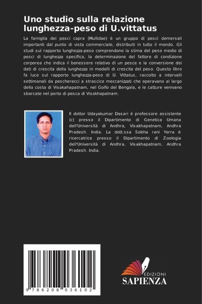 La famiglia dei pesci capra (Mullidae) è un gruppo di pesci demersali importanti dal punto di vista commerciale, distribuiti in tutto il mondo. Gli studi sul rapporto lunghezza-peso comprendono la stima del peso medio di pesci di lunghezza specifica, la determinazione del fattore di condizione corporea che indica il benessere relativo di un pesce e la conversione dei dati di crescita della lunghezza in modelli di crescita del peso. Questo libro fa luce sul rapporto lunghezza-peso di U. Vittatus, raccolto a intervalli settimanali da pescherecci a strascico meccanizzati che operavano al largo della costa di Visakahapatnam, nel Golfo del Bengala, e le catture venivano sbarcate nel porto di pesca di Visakhapatnam.