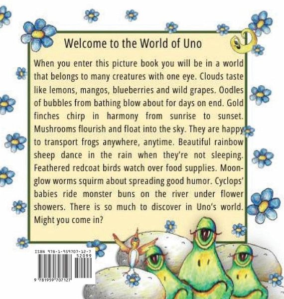 "Uno's World" is an inventive picture book that visually celebrates the extraordinary homeland of Uno the baby cyclops along with all the other cyclops creatures. In "Uno's World", you can fly on floating mushrooms above a continuous landscape of candy-colored trees and fields of one-eyed flowers. You can make friends with one-eyed frogs, birds and even dolphins along the way. You will meet mysterious lily pads who quietly watch over you as you voyage about. Raindrops too, have an eye on you and transform into a life-giving lake. Imagination is celebrated in this entertaining visual ride. The illustrations will tickle your fancy and will provoke one's sense of story. "Uno's World" is a great companion to the books "Hush Little Cyclops Don't You Cry", Have You Seen my Mom" and "I am."