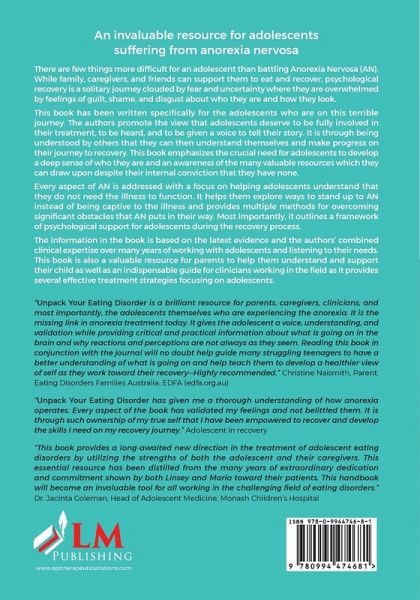 An invaluable resource for adolescents suffering from anorexia nervosa There are few things more difficult for an adolescent than battling Anorexia Nervosa (AN). While family, caregivers, and friends can support them to eat and recover, psychological recovery is a solitary journey clouded by fear and uncertainty where they are overwhelmed by feelings of guilt, shame, and disgust about who they are and how they look. This book has been written specifically for the adolescents who are on this terrible journey. The authors promote the view that adolescents deserve to be fully involved in their treatment, to be heard, and to be given a voice to tell their story. It is through being understood by others that they can then understand themselves and make progress on their journey to recovery. This book emphasizes the crucial need for adolescents to develop a deep sense of who they are and an awareness of the many valuable resources which they can draw upon despite their internal conviction that they have none. Every aspect of AN is addressed with a focus on helping adolescents understand that they do not need the illness to function. It helps them explore ways to stand up to AN instead of being captive to the illness and provides multiple methods for overcoming significant obstacles that AN puts in their way. Most importantly, it outlines a framework of psychological support for adolescents during the recovery process. The information in the book is based on the latest evidence and the authors’ combined clinical expertise over many years of working with adolescents and listening to their needs. This book is also a valuable resource for parents to help them understand and support their child as well as an indispensable guide for clinicians working in the field as it provides several effective treatment strategies focusing on adolescents. Praise for Unpack Your Eating Disorder "Unpack Your Eating Disorder is a brilliant resource for parents, caregivers, clinicians, and most importantly, the adolescents themselves who are experiencing the anorexia. It is the missing link in anorexia treatment today. It gives the adolescent a voice, understanding, and validation while providing critical and practical information about what is going on in the brain and why reactions and perceptions are not always as they seem. Reading this book in conjunction with the journal will no doubt help guide many struggling teenagers to have a better understanding of what is going on and help teach them to develop a healthier view of self as they work toward their recovery—Highly recommended." Christine Naismith, Parent. Eating Disorders Families Australia, EDFA (edfa.org.au)