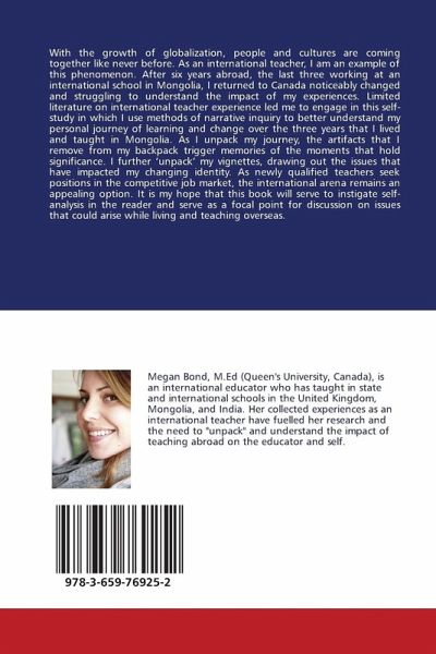 With the growth of globalization, people and cultures are coming together like never before. As an international teacher, I am an example of this phenomenon. After six years abroad, the last three working at an international school in Mongolia, I returned to Canada noticeably changed and struggling to understand the impact of my experiences. Limited literature on international teacher experience led me to engage in this self-study in which I use methods of narrative inquiry to better understand my personal journey of learning and change over the three years that I lived and taught in Mongolia. As I unpack my journey, the artifacts that I remove from my backpack trigger memories of the moments that hold significance. I further 'unpack' my vignettes, drawing out the issues that have impacted my changing identity. As newly qualified teachers seek positions in the competitive job market, the international arena remains an appealing option. It is my hope that this book will serve to instigate self-analysis in the reader and serve as a focal point for discussion on issues that could arise while living and teaching overseas.