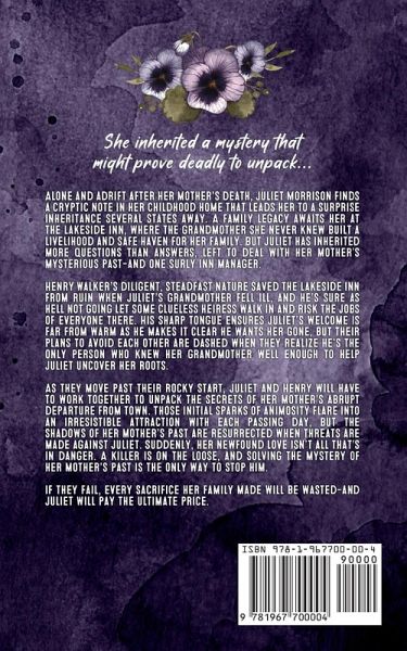 She inherited a mystery that might prove deadly to unpack... Alone and adrift after her mother's death, Juliet Morrison finds a cryptic note in her childhood home that leads her to a surprise inheritance several states away. A family legacy awaits her at the Lakeside Inn, where the grandmother she never knew built a livelihood and safe haven for her family. But Juliet has inherited more questions than answers, left to deal with her mother's mysterious past-and one surly inn manager. Henry Walker's diligent, steadfast nature saved the Lakeside Inn from ruin when Juliet's grandmother fell ill, and he's sure as hell not going let some clueless heiress walk in and risk the jobs of everyone there. His sharp tongue ensures Juliet's welcome is far from warm as he makes it clear he wants her gone, but their plans to avoid each other are dashed when they realize he's the only person who knew her grandmother well enough to help Juliet uncover her roots. As they move past their rocky start, Juliet and Henry will have to work together to unpack the secrets of her mother's abrupt departure from town. Those initial sparks of animosity flare into an irresistible attraction with each passing day, but the shadows of her mother's past are resurrected when threats are made against Juliet. Suddenly, her newfound love isn't all that's in danger. A killer is on the loose, and solving the mystery of her mother's past is the only way to stop him. If they fail, every sacrifice her family made will be wasted-and Juliet will pay the ultimate price.