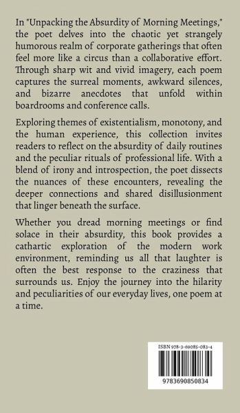 In "Unpacking the Absurdity of Morning Meetings," the poet delves into the chaotic yet strangely humorous realm of corporate gatherings that often feel more like a circus than a collaborative effort. Through sharp wit and vivid imagery, each poem captures the surreal moments, awkward silences, and bizarre anecdotes that unfold within boardrooms and conference calls. Exploring themes of existentialism, monotony, and the human experience, this collection invites readers to reflect on the absurdity of daily routines and the peculiar rituals of professional life. With a blend of irony and introspection, the poet dissects the nuances of these encounters, revealing the deeper connections and shared disillusionment that linger beneath the surface. Whether you dread morning meetings or find solace in their absurdity, this book provides a cathartic exploration of the modern work environment, reminding us all that laughter is often the best response to the craziness that surrounds us. Enjoy the journey into the hilarity and peculiarities of our everyday lives, one poem at a time.