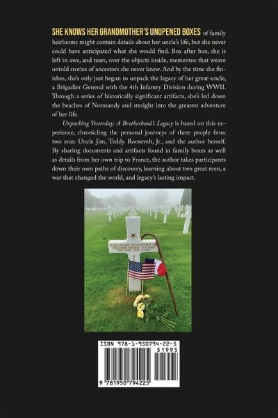 She knows her grandmother’s unopened boxes of family heirlooms might contain details about her uncle’s life, but she never could have anticipated what she would find. Box after box, she is left in awe, and tears, over the objects inside, mementos that weave untold stories of ancestors she never knew. And by the time she finishes, she’s only just begun to unpack the legacy of her great-uncle, a Brigadier General with the 4th Infantry Division during WWII. Through a series of historically significant artifacts, she’s led down the beaches of Normandy and straight into the greatest adventure of her life. Unpacking Yesterday: A Brotherhood’s Legacy is based on this experience, chronicling the personal journeys of three people from two eras: Uncle Jim, Teddy Roosevelt, Jr., and the author herself. By sharing documents and artifacts found in family boxes as well as details from her own trip to France, the author takes participants down their own paths of discovery, learning about two great men, a war that changed the world, and legacy’s lasting impact.