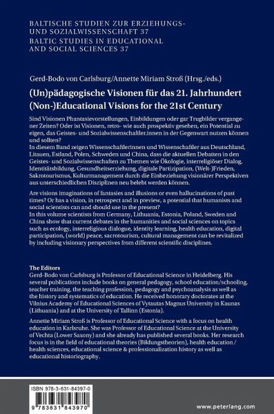 In this volume scientistsfrom Germany, Lithuania, Estonia, Poland, Sweden and China show that current debates in the humanities and social sciences on topics such as ecology, interreligious dialogue, identity learning, health education, digital participation, (world) peace, sacrotourism, cultural management can be revitalized by including visionary perspectives from different scientific disciplines.