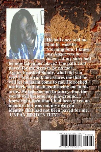 He had once told me he was the Morning Sun. I felt my Angel was no longer at my side; has he now taken her place? The path God paved for me seem to be no more. Again, he asks Sandy, what did you see? I was afraid, he assures me that he will let no harm come to me. He rocked me back and forth, embracing me in his arms. He tells me not to worry, that the world will become my playground. I knew right then that I had been given an identity that was not my own; an identity that had not been paved for me. UNPAVED IDENTITY.