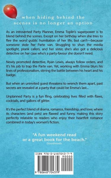 "Where hiding behind the scenes is no longer an option and when chaos becomes part of the plan..." For the introverted party planner, Emma Toplin, her superpower is to blend behind the scenes. Except on her birthday when she tries to flee the worst public humiliation of her life, but can't-because someone stole her Parte` van. Struggling to shun the media spotlight, prank callers, and her sister, she's also got a delicious detective on her case who's a party-favour she doesn't need. Newly promoted detective, Ryan Lewis, always follow orders, and it's his job to trap the Parte` van. Yet working with Emma blurs his lines of professionalism, stirring the battle between his heart and his badge. But when an uninvited guest threatens to wrench them apart, past secrets are revealed at a party that could be Emma's last... UNPLANNED PARTY is where chaos is all part of the plan! It's the perfect blend of drama, romance, friendship, and love; where its characters (and pets) are flawed and funny, making them perfectly relatable to readers who enjoy their heartfelt romance combined crime in today's women's fiction. "Love these characters and their screwed-up lives!" Goodreads