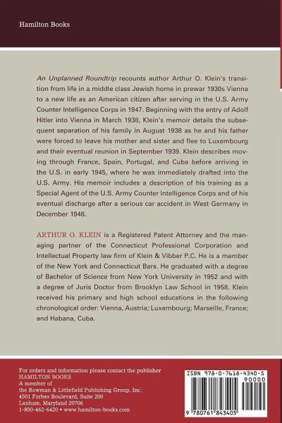 An Unplanned Roundtrip recounts author Arthur O. Klein's transition from life in a middle class Jewish home in prewar 1930s Vienna to a new life as an American citizen after serving in the U.S. Army Counter Intelligence Corps in 1947. Beginning with the entry of Adolf Hitler into Vienna in March 1938, Klein's memoir details the subsequent separation of his family in August 1938 as he and his father were forced to leave his mother and sister and flee to Luxembourg and their eventual reunion in September 1939. Klein describes moving through France, Spain, Portugal and Cuba before arriving in the U.S. in early 1945, where he was immediately drafted into the U.S. Army. His memoir includes a description of his training as a Special Agent of the U.S. Army Counter Intelligence Corps and of his eventual discharge after a serious car accident in West Germany in December 1946.