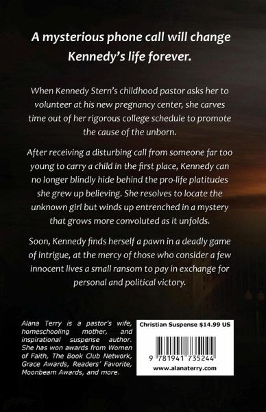 When Kennedy Stern's childhood pastor asks her to volunteer at his new pregnancy center, she carves time out of her rigorous college schedule to promote the cause of the unborn. After receiving a disturbing call from someone far too young to carry a child in the first place, Kennedy can no longer blindly hide behind the pro-life platitudes she grew up believing. She resolves to locate the unknown girl but winds up entrenched in a mystery that grows more convoluted as it unfolds. Soon, Kennedy finds herself a pawn in a deadly game of intrigue, at the mercy of those who consider a few innocent lives a small ransom to pay in exchange for personal and political victory.