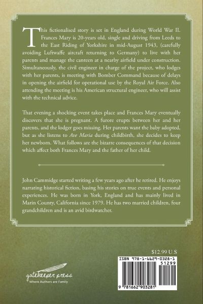 UNPLANNED: This fictionalised story is set in England during World War II. Frances Mary is 20-years old, single and driving from Leeds to the East Riding of Yorkshire in mid-August 1943, (carefully avoiding Luftwaffe aircraft returning to Germany) to live with her parents and manage the canteen at a nearby airfield under construction. Simultaneously, the civil engineer in charge of the project, who lodges with her parents, is meeting with Bomber Command because of delays in opening the airfield for operational use by the Royal Air Force. Also attending the meeting is his American structural engineer, who will assist with the technical advice. That evening a shocking event takes place and Frances Mary eventually discovers that she is pregnant. A furore erupts between her and her parents, and the lodger goes missing. Her parents want the baby adopted, but as she listens to Ave Maria during childbirth, she decides to keep her newborn. What follows are the bizarre consequences of that decision which affect both Frances Mary and the father of her child.