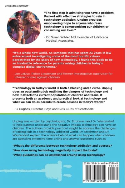 "The first step is admitting you have a problem. Packed with effective strategies to rein in technology addiction, Unplug provides empowering hope to anyone who fears technology is compromising our children or consuming our lives." - Dr. Susan Wilder, MD, Founder of LifeScape Medical Associates. "It's a whole new world. As someone that has spent 23 years in law enforcement investigating some of the most horrific crimes perpetrated by the users of new technology, I found this book to be an invaluable reference for parents raising children in today's complex digital environment." - Joe LeDuc, Police Lieutenant and former investigative supervisor for Internet crimes against children